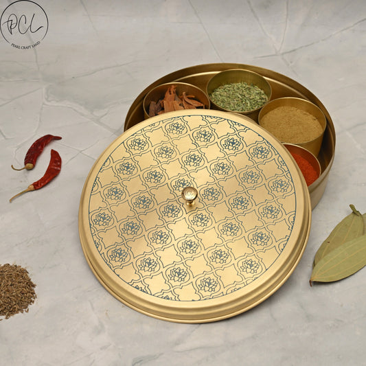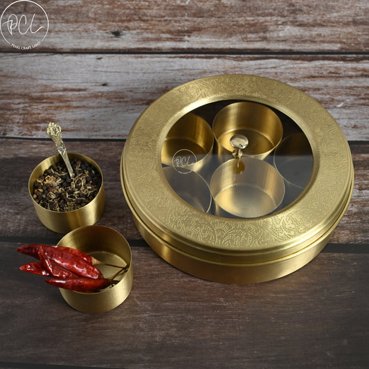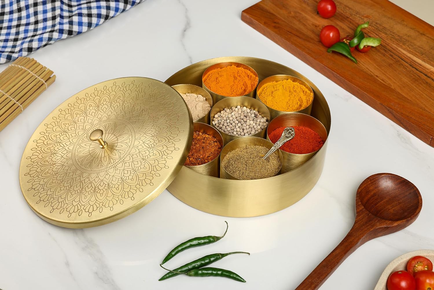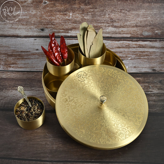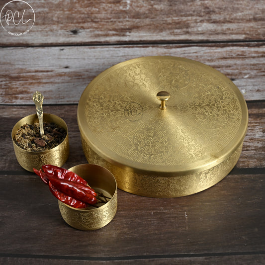 Handcrafted Brass Masala Box Full Etched Set for Kitchen with Spoon