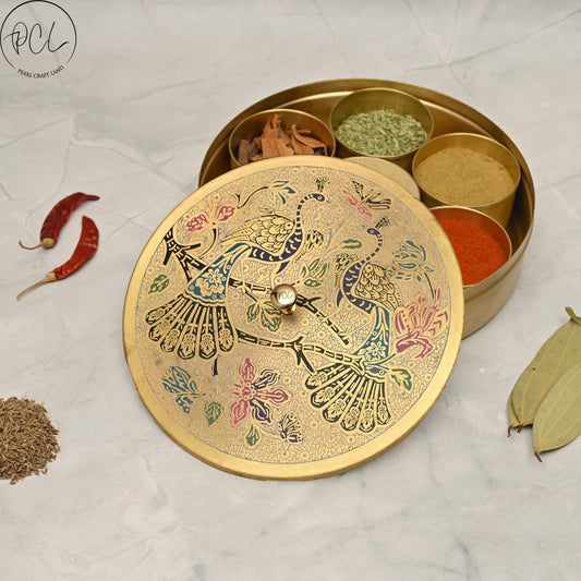 Handcrafted Brass Masala Box Peacock Design Set for Kitchen with Spoon (7 Container)
