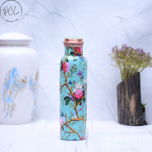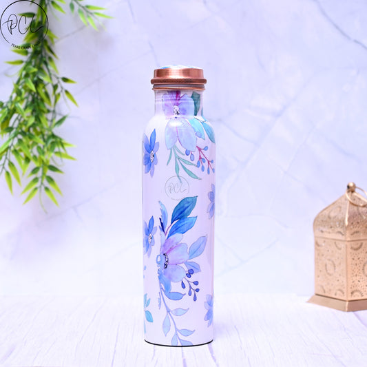Pure Copper Blue Flower Printed Water Bottle with Leak Proof Capacity 1000 ML.