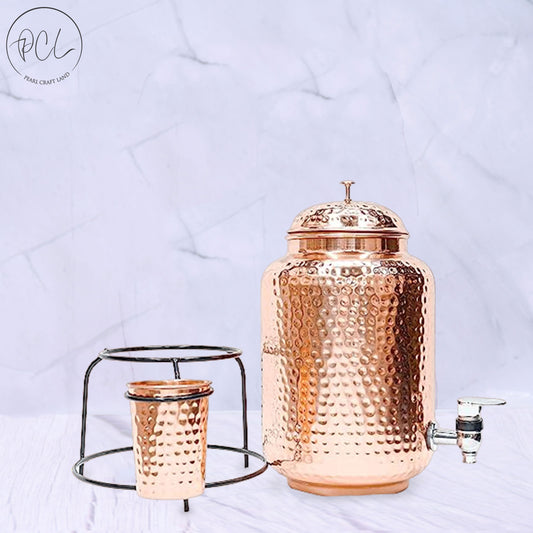 Pure Copper Hammered Water Dispenser with Glass and Stand (Matka) Combo 5000ml