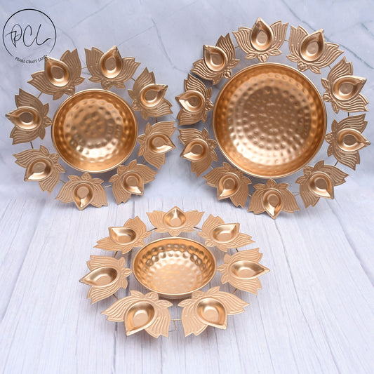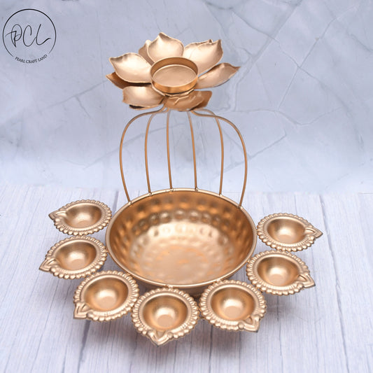 Exclusive Handmade Iron Urli Bowl and Metal Diya Set in Lotus Shape with Gold Powder Coating for Home Decor