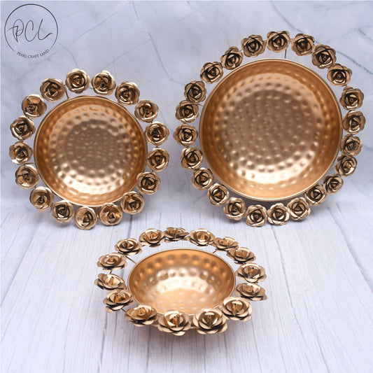 Exclusive Rose Design Urli Bowl for Home Decor with Floating Flowers and Candles( Set of 3 )