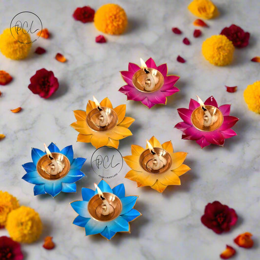 Exclusive Colorful Flower Shaped Brass Metal Diyas Diwali Special Set of 6