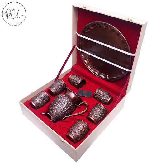 Exclusive Pure Copper Embroidery Lemon Set with Antique Finish 1 Jug , 6 Glasses With Tray