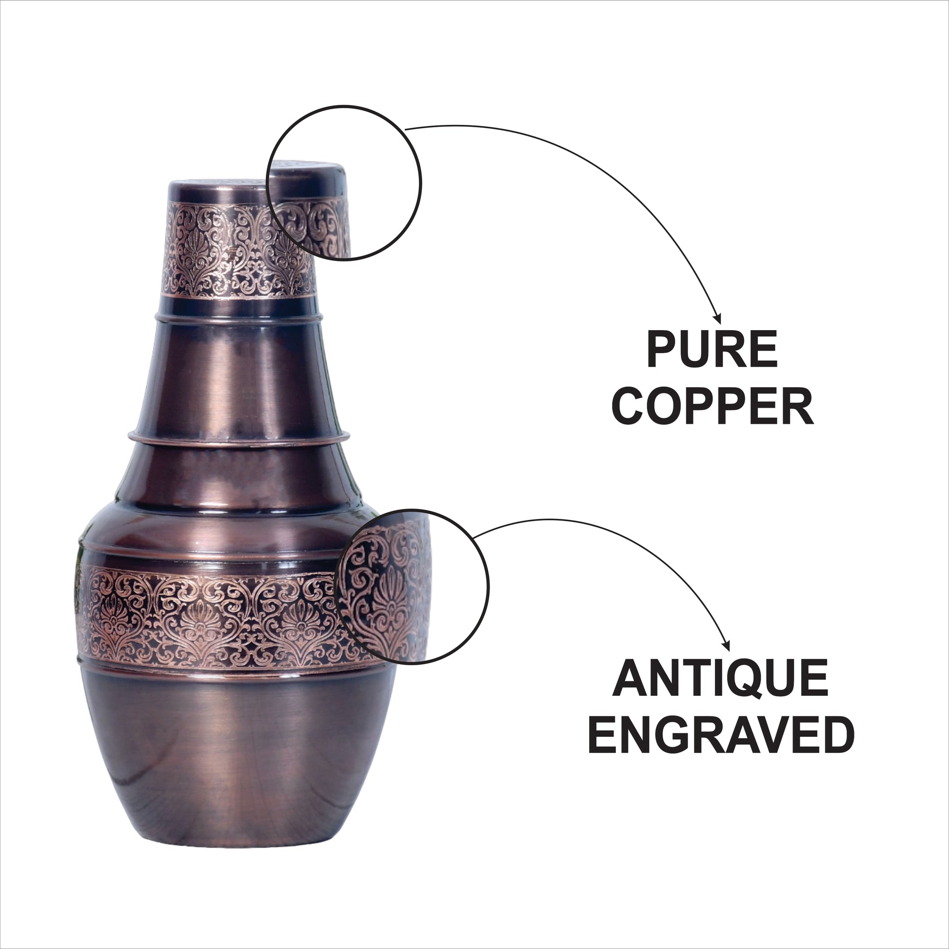 Pure Copper Bedside Venus Jar Antique Engraved with Inbuilt Glass Capacity 1400 ML.