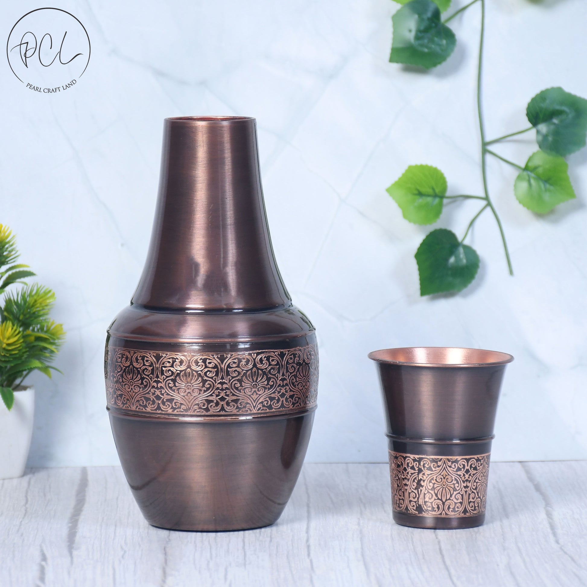 PCL presents our Copper Bedside Venus Jar Antique Engraved with Inbuilt Glass Capacity 1400 ML. A beautiful and functional addition to your bedroom. Crafted from pure-quality copper, the bottle is hand-hammered to create a unique and elegant textured surface:-